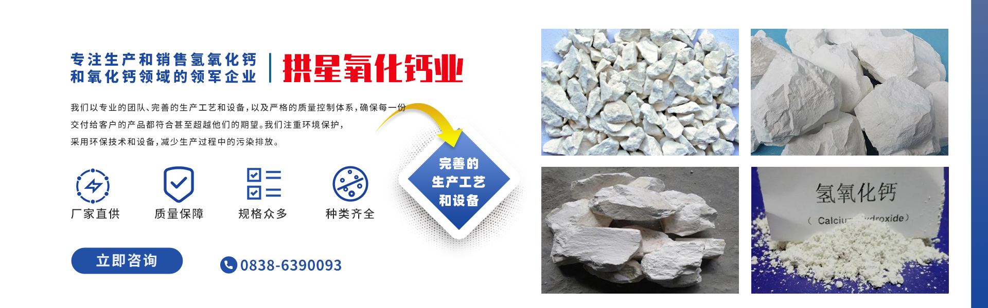 綿竹市拱星氧化鈣業有限公司是一家在生產和銷售氧化鈣領域的領軍企業,成立于1998年,始終致力于提供高質量的產品。公司的主要產品包括氫氧化鈣和氧化鈣,這些產品廣泛應用于農業、建筑、塑料和橡膠工業等領域。   我們以專業的團隊、先進的生產工藝和設備,以及嚴格的質量控制體系,確保每一份交付給客戶的產品都符合甚至超越他們的期望。我們注重環境保護,采用環保技術和設備,減少生產過程中的污染排放。   ...